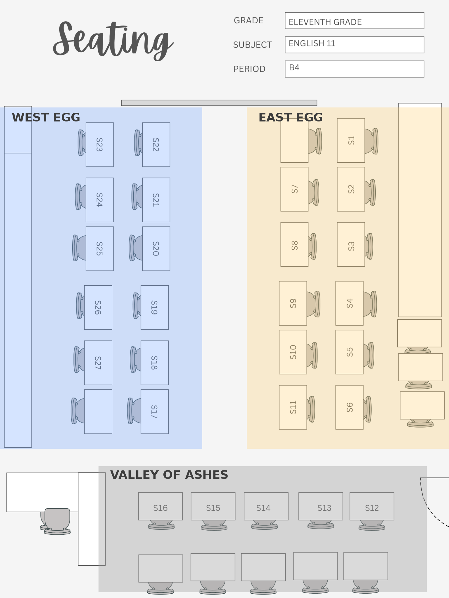 This is a seating chart that I created for our eleventh-grade The Great Gatsby unit. For this unit, I divided the room into three sections: East Egg, West Egg, and the Valley of Ashes. Each area represents a study group for the novel and is intentionally structured to promote collaborative learning. This grouping supports peer discussion, shared inquiry, and collective analysis of the text, helping foster a culture of learning and active student engagement.