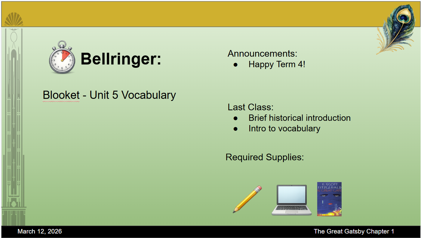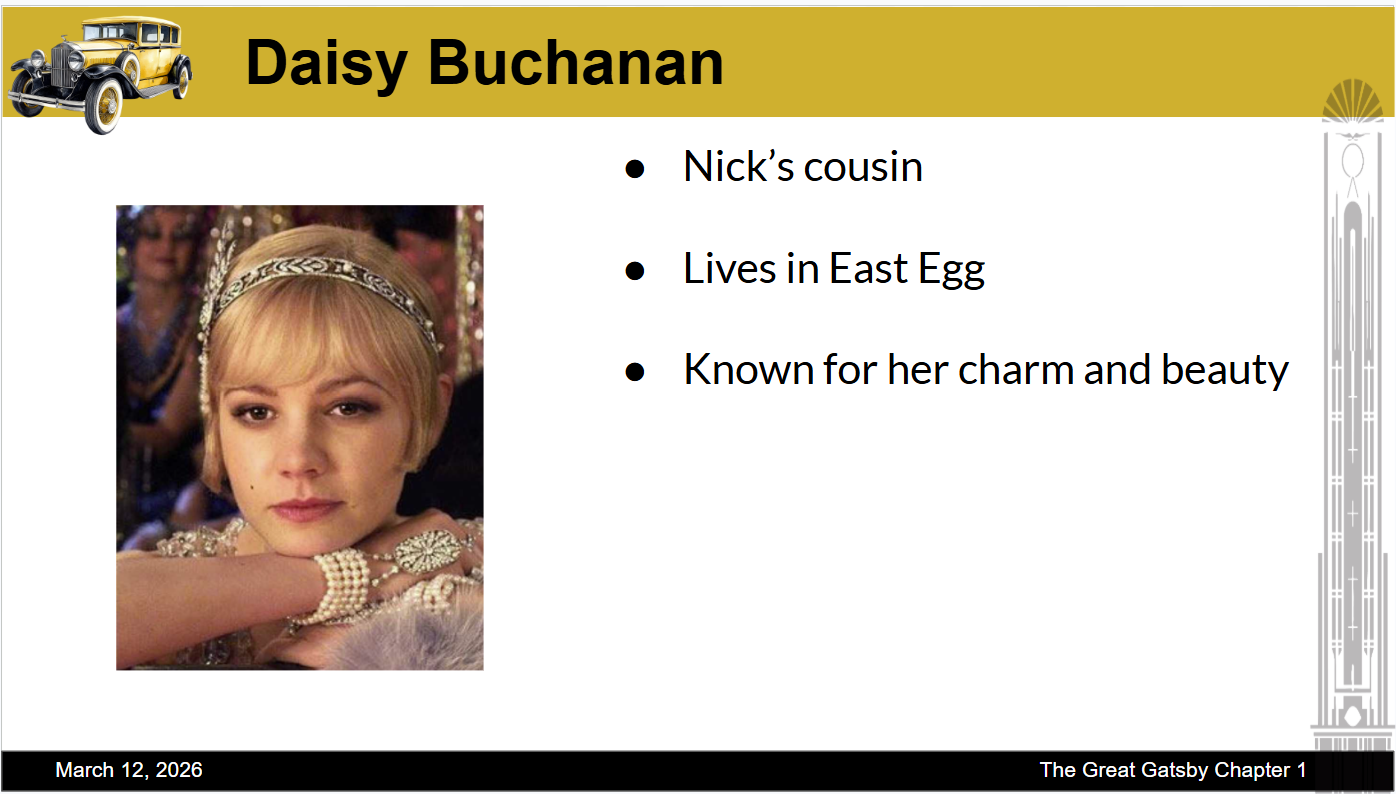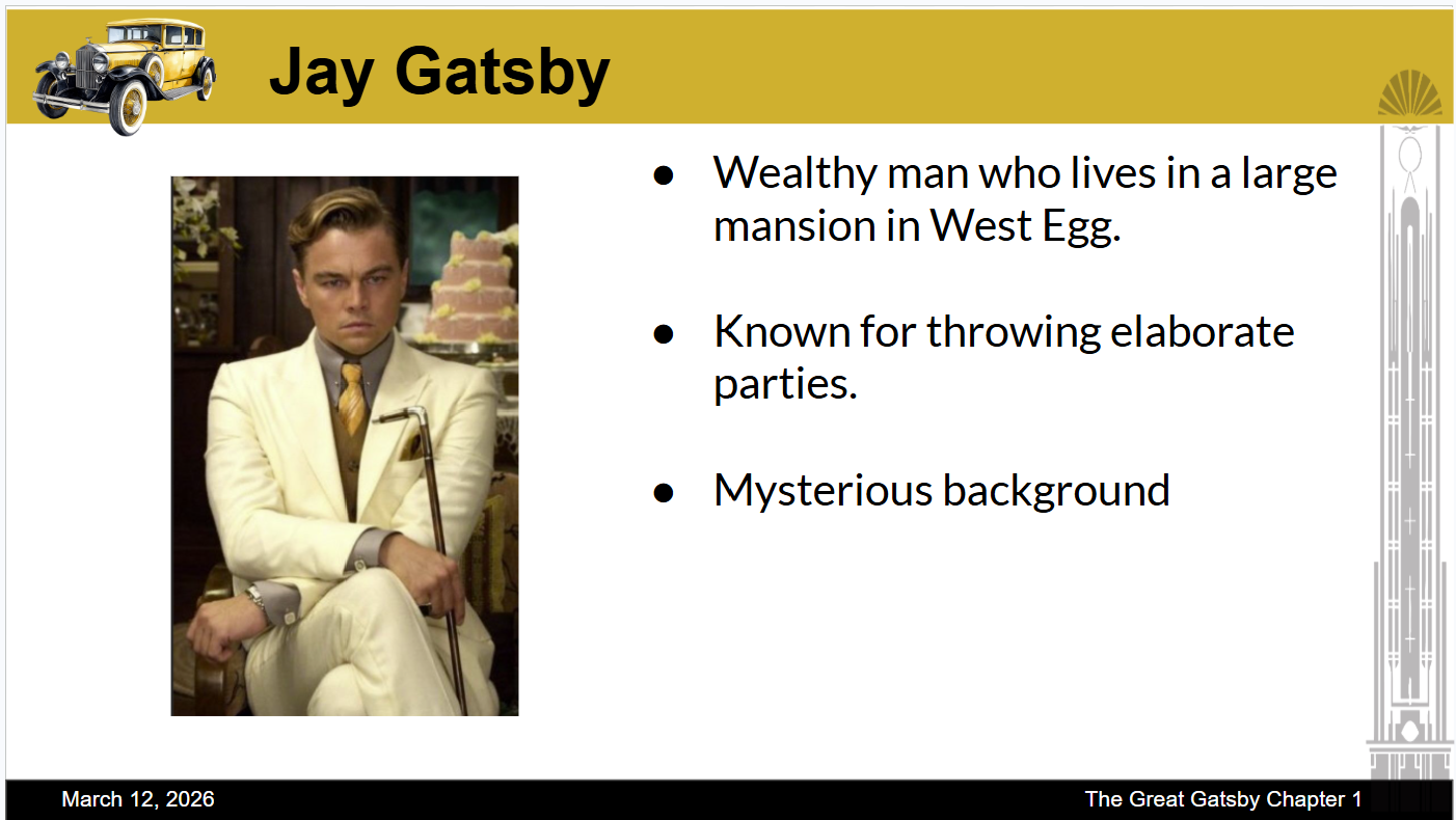 This is a slide deck that I created for Chapter 1 of The Great Gatsby. For the character introductions, I included only high-level details to avoid spoilers. For this unit, I also assigned each group a specific color to track during the in-class reading. Students will be responsible for tracking their assigned color and identifying its symbolism. At the end of the unit, students will participate in a collaborative jigsaw activity to combine their findings and explain the symbolism behind each color.